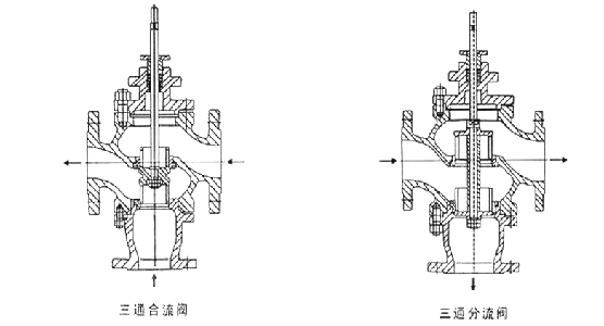 電動三通控制閥分為三通合流型和三通分流型調(diào)節(jié)閥;采用圓筒型薄壁窗口形閥芯導向。配用直行程電動執(zhí)行機構(gòu),接受0~10或4~20mA.DC或開關(guān)量信號驅(qū)動閥門啟閉。其中三通合流調(diào)節(jié)閥用于將兩種流體混合成第三種流體,或不同溫度的同種流體,混合成同一溫度流體。三通分流閥將一種流體分成兩路流體。本系列產(chǎn)品口徑由20mm至300mm,公稱壓力有1.6、4.0、6.4MPa,溫度范圍-60℃至450℃,控制信號為0~10或4~20mA.DC。配用不同的執(zhí)行機構(gòu)可分為普通型和電子型兩種。