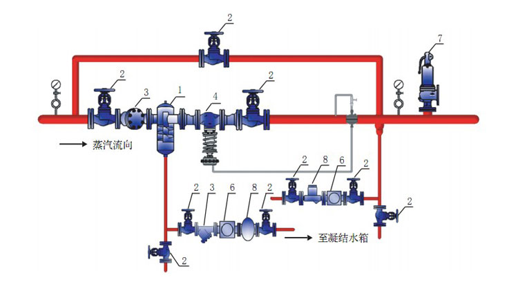 建議在減壓站出口處安裝管道疏水閥組,當(dāng)停機(jī)時(shí)能迅速排出冷凝水防止形成管道水錘。