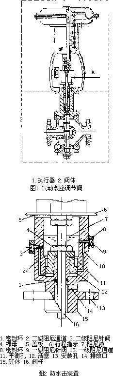 根據(jù)分析,在閥門(mén)執(zhí)行機(jī)構(gòu)上增設(shè)一個(gè)阻尼機(jī)構(gòu),使之在接近關(guān)閉行程的最后20%范圍內(nèi)發(fā)揮作用,讓閥門(mén)分程緩關(guān)閉。也就是說(shuō),在關(guān)閥行程的0~80%范圍內(nèi),此阻尼機(jī)構(gòu)不起作用,以保證閥門(mén)有良好的動(dòng)作靈敏性,而在最后的20%關(guān)閥行程中分為2級(jí)阻尼,使之越到接近全關(guān)的位置,阻尼越強(qiáng)烈,消除了流速瞬變?cè)斐傻乃畵粑:Ω矗渲?級(jí)阻尼的強(qiáng)度可以用針閥調(diào)節(jié),便于根據(jù)不同的閥門(mén)和過(guò)程對(duì)象,選擇最佳阻尼,達(dá)到防水擊的最好效果。