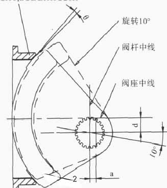 氣動(電動)雙偏心半球閥(圖1)的半球體采用雙偏心設(shè)計,密封效果可靠,瞬間脫開,力矩小,使用壽命長�?蓱�(yīng)用在輸送顆粒類介質(zhì)的苛刻工況中。其結(jié)構(gòu)原理是半球體(圖2)中線與閥桿中線偏置尺寸a,與閥座中線偏置尺寸b,全開時球體與閥座完全脫開,并有一定的間隙,回轉(zhuǎn)半徑分為長半徑和短半徑,在長半徑轉(zhuǎn)動軌跡的切線會與閥座密封面形成一個θ角,在閥門啟閉時,半球相對閥座面有一個漸出脫離(如圖在開度10°時,芯已經(jīng)完全脫離)和漸入擠壓的作用,從而降低了啟閉時閥座與半球之間的機械磨損和擦傷,提高了使用壽命。
