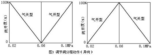 分程控制系統(tǒng)中,氣動(dòng)薄膜調(diào)節(jié)閥的開閉形式,可分同向和異向兩種,見圖2和圖3。