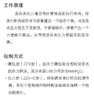 ZZV型自力式微壓調(diào)節(jié)閥是一種不需要外加能源的自力式執(zhí)行器產(chǎn)品。自力式微壓調(diào)節(jié)閥可分段調(diào)節(jié):從50mm.W.C至0.1MPa。其用途十分廣泛,可用于工業(yè)燃燒爐系統(tǒng)微壓減壓、穩(wěn)壓�?刂苾煞N物料,如煤氣、空氣流量配比,以達(dá)理想燃燒。用于氫冷發(fā)電機(jī)組密封油系統(tǒng),控制密封油與氫氣間壓力差,以確�?煽棵芊�。當(dāng)差壓閥的低壓端通大氣即為微壓閥(差壓閥負(fù)壓,端壓,力為零)。