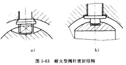 3-63為耐火型閥桿密封結(jié)構(gòu);一旦失火,軟質(zhì)填料被燒毀或軟化,閥體體腔內(nèi)的流體壓力將閥桿推向閥體閥桿上的臺肩被閥體擋住,并藉高壓流體壓力作用壓緊而密封;此外,它還能防止腔內(nèi)異常升壓時閥桿沖出體外。