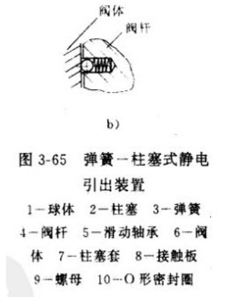 圖3-65a所示為彈簧一柱塞式靜電引出裝置。壓縮彈簧加載于柱塞,使球體與閥桿以及閥桿與閥體之間形成靜電通道。這樣,因摩擦產(chǎn)生的靜電便通過彈簧一柱塞傳到閥桿和閥體,從而通過管道與地接通,達到消除靜電積累之目的。