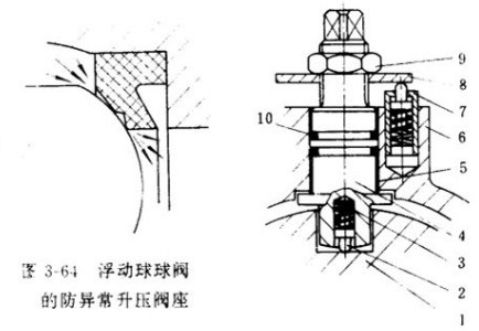 對于固定球球閥;可采用圖3-22和圖3-24所示彈性閥座。當閥體體腔內(nèi)壓力異常升高時,將反向推動閥座后退使之與球體脫離接觸。流體則沿著閥座與球體之間的間隙流出,消除過壓現(xiàn)象�! �