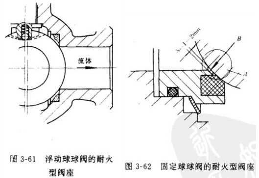 3-61為浮動球球閥的耐火型閥座密封結(jié)構(gòu)。一旦失火,其高分子材料閥座被燒毀,球閥的球體在流體壓力作用下,就會向閥后閥座方向推進,使之與加工成直角的閥體閥座槽金屬座面接觸。起到臨時和部分密封作用.避免災(zāi)情進一步擴大。
