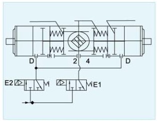 兩段式氣動執(zhí)行器由標(biāo)準氣動執(zhí)行器和另外兩個附加的外部氣缸組成,通過改變附加氣缸的活塞行程,執(zhí)行器和閥門轉(zhuǎn)角被停止在預(yù)先設(shè)定的角度(5°至85°)。因此,閥門流量得以調(diào)節(jié)。這種裝置由兩個電磁閥控制。如圖:E1=二位三通電磁閥(FC),控制執(zhí)行器;E2=二位三通電磁閥(FO),用于控制兩個外部氣缸。
