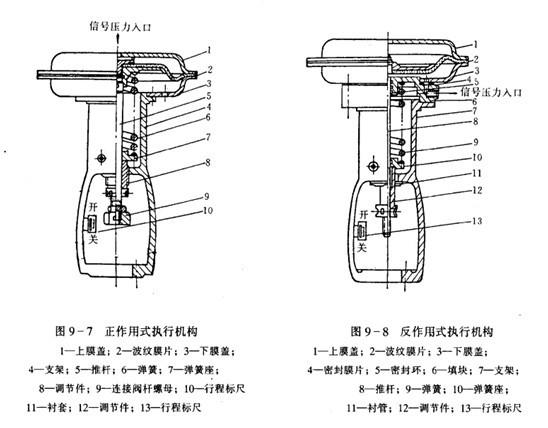 在氣動(dòng)薄膜調(diào)節(jié)閥執(zhí)行機(jī)構(gòu)推桿的周圍采用密封的辦法,可以使下氣室構(gòu)成壓力密封,調(diào)節(jié)系統(tǒng)的氣動(dòng)信號(hào)可以連接到該氣室上,把上氣室接通大氣,并改變彈簧的安裝方案,使推桿向上移動(dòng)時(shí)壓縮彈簧。這樣,在下氣室中的信號(hào)壓力增加時(shí)就會(huì)造成推桿向上運(yùn)動(dòng)。這種形式的執(zhí)行機(jī)構(gòu)通常被稱為反作用執(zhí)行機(jī)構(gòu)。