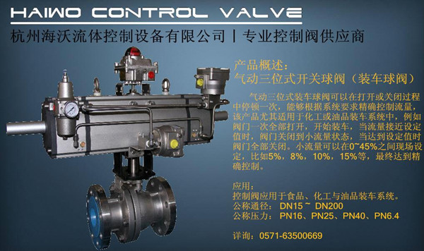 氣動三位式控制球閥(氣動裝車球閥)可以在打開或關(guān)閉過程中停頓一次,能夠根據(jù)系統(tǒng)要求精確控制流量,氣動三位式控制球閥(氣動裝車球閥)尤其適用于化工或油品裝車系統(tǒng)中,例如閥門一次全部打開,開始裝車,當流量接近設(shè)定值時,閥門關(guān)閉到小流量狀態(tài),當達到設(shè)定值時閥門全部關(guān)閉。小流量可以在0~45%之間現(xiàn)場設(shè)定,比如5%,8%,10%,15%等,最終達到精確控制。